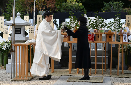 三笠宮妃百合子さまの墓所で拝礼に臨まれる三笠宮家当主の彬子さま=15日午後、東京都文京区の豊島岡墓地(代表撮影) 【時事通信社】