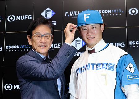 入団会見を終え、撮影に応じる日本ハムの西川遥輝外野手(右)。左は栗山英樹チーフ・ベースボール・オフィサー(CBO)=8日、エスコンフィールド北海道 【時事通信社】