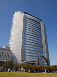 高崎市庁舎は地下2階、地上21階、高さ102.5メートル、1998年竣工。ビル風の抑制を目的にした南北に長い楕円形の形状が特徴。21階に設けられた展望ロビーから関東平野が一望できる。