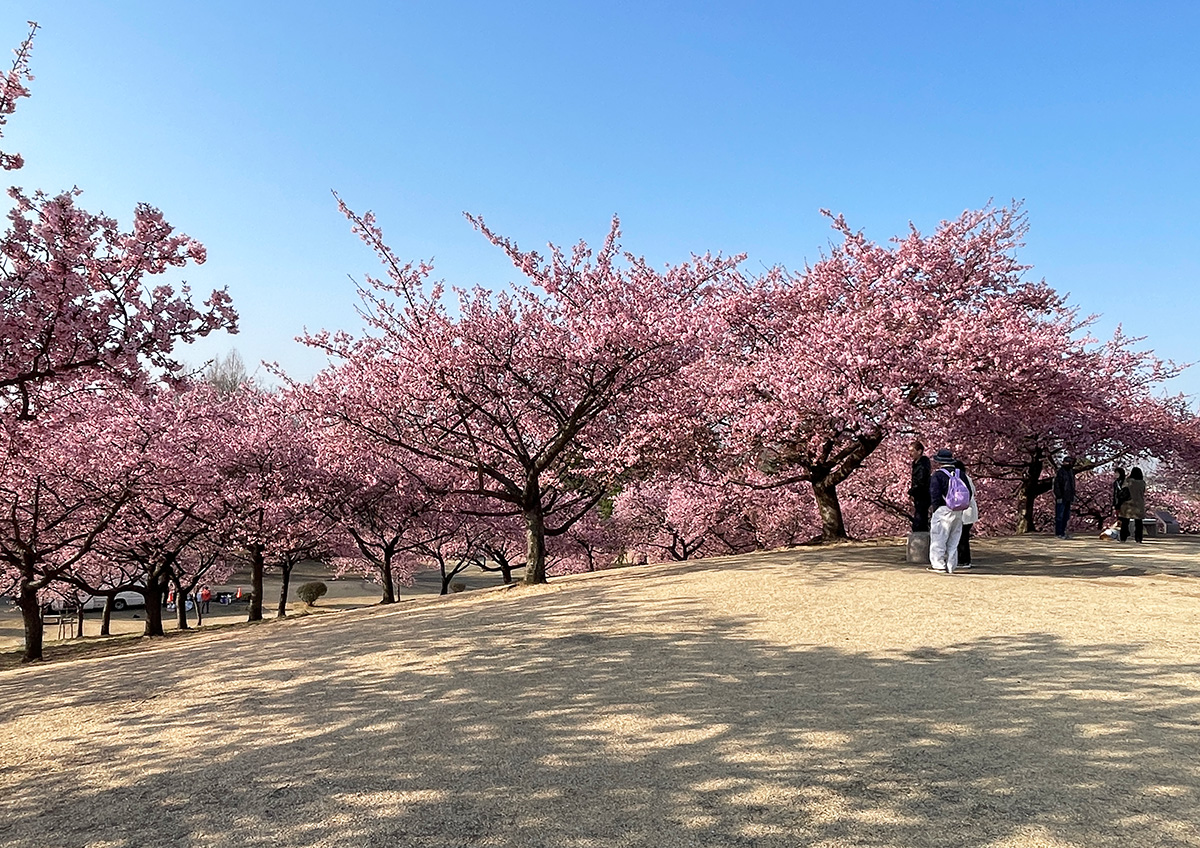 「伊勢崎市みらい公園(いせさき市民のもり公園)」(伊勢崎市山王町)の河津桜が開花し、4分咲き程度まで進んだ。