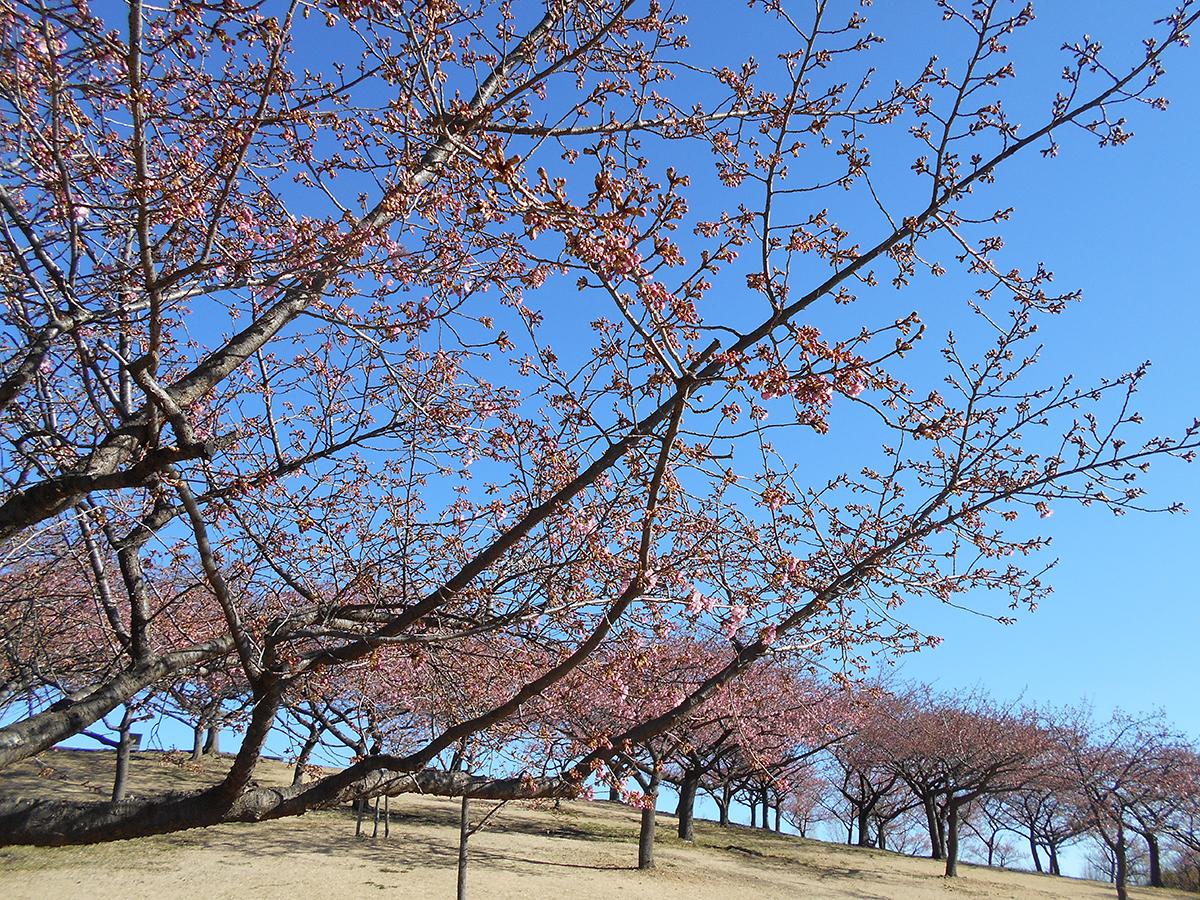 「伊勢崎市みらい公園(いせさき市民のもり公園)」(伊勢崎市山王町)の河津桜が開花し、4分咲き程度まで進んだ。