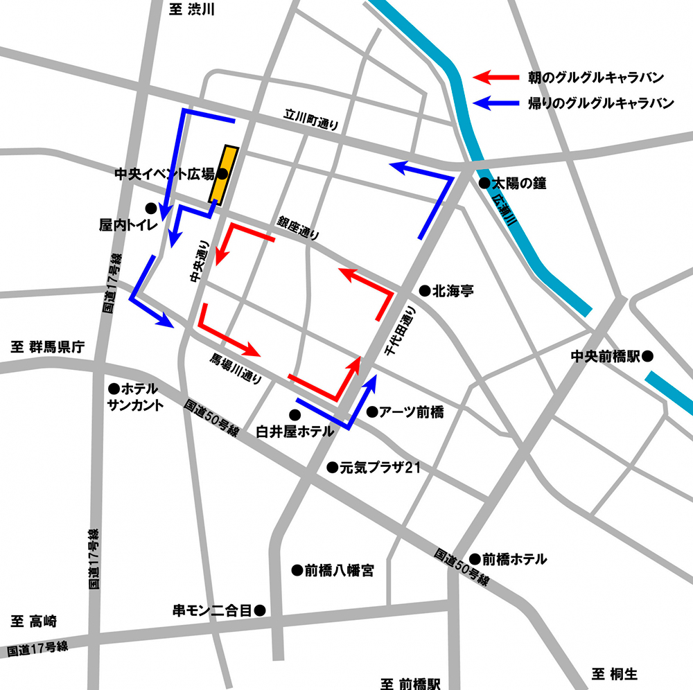 朝のぐるぐるキャラバンコースと帰りのぐるぐるキャラバンコース 前橋「いちにちワーゲン博物館」ワーゲン40台、市街地ぐるぐる  <記事に戻る>
