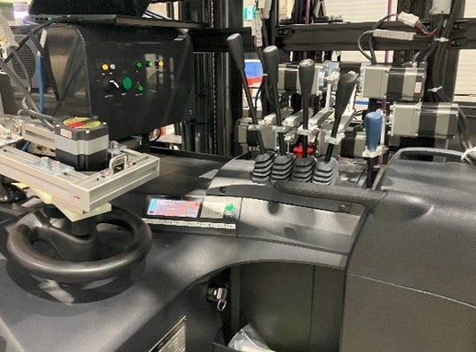 運転に必要な各操作レバーを遠隔操作するためのアクチュエータを開発、遠隔操作者による繊細な操作をフォークリフト機体側で再現することで有人と同等の操作性を実現します。