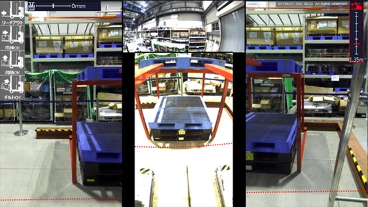 本システムは既存フォークリフトに、センサや複数のカメラを取り付け、遠隔操作を可能にするものです。