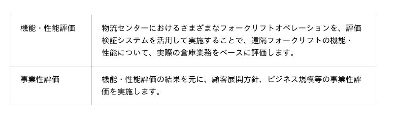 本システムの開発に当たって、ロジスティードが保有する遠隔フォークリフト作業検証による知見と技術検証ノウハウを活用し、同社グループの物流センターにてフィールド実証実験を行います。さらに、三菱HCキャピタルの強みである顧客とのネットワーク力を生かし、今後の事業性評価も実施します。