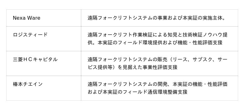 今後、Nexa Ware、ロジスティード、三菱HCキャピタル、椿本チエインの4社で実証実験(以下 本実証)を行い、遠隔フォークリフトの機能・性能、事業性等を評価・検証してまいります。