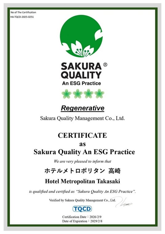 【2026年3月】高崎 --- 株式会社ホテルメトロポリタン高崎(住所:群馬県高崎市八島町222番地/代表取締役社長兼総支配人:前田淳)は2026年2月9日、SDGsを実践する宿泊施設の国際認証「Sakura Quality An ESG Practice(通称:サクラクオリティグリーン)」において、最高ランクに次ぐ「4御衣黄(ぎょいこう)ザクラ」を取得いたしました 。本認証は、米国GSTC(グローバル・サステナブル・ツーリズム協議会)の承認を受けた宿泊施設向けの日本発ESG認証です 。5段階評価のうち上から2番目となる「4御衣黄ザクラ」は、持続可能な社会の実現に向け、積極的かつ具体的な取り組みを継続している施設に与えられます 。群馬県内のホテルとしては初の認証取得であり、かつこのランクでの取得は県内の全宿泊施設においても初となります 。世界的なサステナビリティ意識の高まりにより、旅先選びにおいても環境や社会への配慮が重要視されています 。当ホテルでは、群馬県認定の「ぐんま地産地消優良店」としての食材活用や、食品ロス削減への積極的な情報発信など、地域と連携したESG活動を推進してまいりました 。今回の認証取得は、こうした全社一丸となった取り組みが客観的に評価されたものです 。今後も、安全・安心で「人にやさしい」ホテルを目指すとともに、地域社会の皆さまと手を取り合い、持続可能な未来の創造に貢献してまいります 。