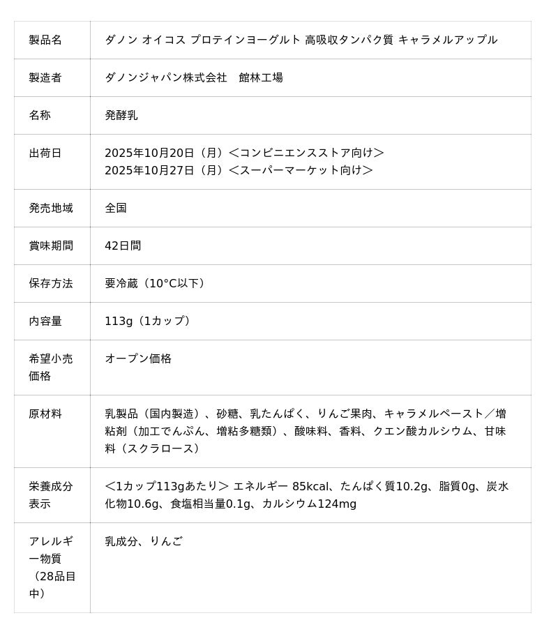 ダノンジャパン株式会社(本社:東京都目黒区、代表取締役社長:ロドリゴ・リマ、以下ダノンジャパン)は、カラダを動かすすべての人の良質なタンパク質補給を応援する「ダノン オイコス」ブランドより、期間限定フレーバーの「ダノン オイコス プロテインヨーグルト 高吸収タンパク質 キャラメルアップル」を発売します。2025年10月20日(月)より全国のコンビニエンスストア向けに、10月27日(月)より全国のスーパーマーケット向けに出荷を開始します。当製品は、りんごの爽やかな味わいと、キャラメルのまろやかな甘みを掛け合わせた一品です。シャキシャキとした果肉の食感とともに、日本人に馴染み深いフジ種のりんごならではの豊かな甘みとほどよい酸味が広がり、最後に芳醇なキャラメルのコクが口いっぱいに広がることで、これからの肌寒い季節にぴったりの濃厚な後味をお楽しみいただけます。
