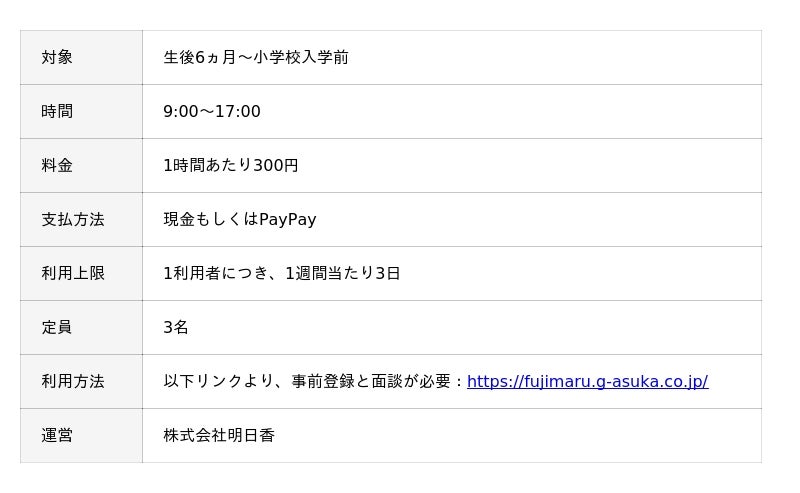 当社は、1994年の創業以来、「一人ひとりの子育てに寄り添う」という理念のもと、保育施設運営、ベビーシッター派遣、学童保育、病児保育など、多様な子育て支援サービスを全国で展開してまいりました。今回の「ふじまる」での運営を通じて、藤岡市の皆様に寄り添い、子どもたちの健やかな成長と、保護者の方々が安心して子育てできる環境づくりに貢献してまいります。地域の子育て支援の拠点として、多くの方々にご利用いただき、笑顔と賑わいあふれる場所となることを目指してまいります。