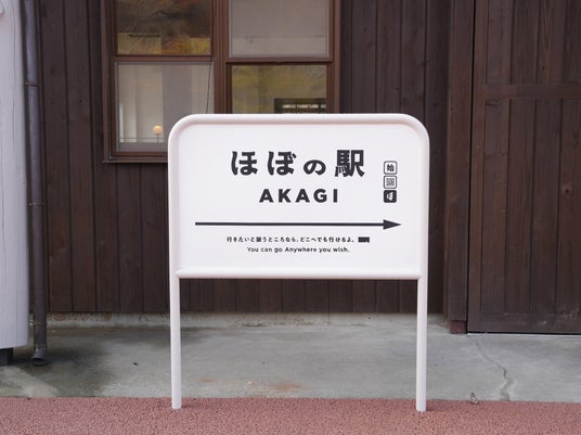 「ほぼの駅 AKAGI」の建物は、ながくレストランとして活用されていたものを、どこか懐かしい駅舎をイメージして改修しています。入口横には新たに「ほぼの駅 AKAGI」駅看板をフォトスポットとして設置しました。駅の椅子をイメージしたベンチや、改札ボックスのような販売カウンターなど、全体的な駅らしいムードもぜひご覧ください。