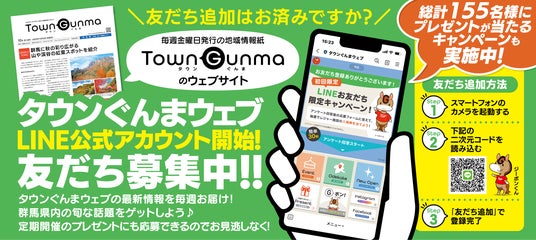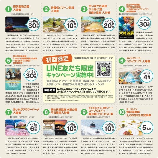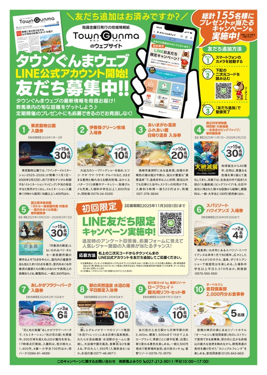 群馬を楽しむ情報マガジンサイト「タウンぐんまウェブ」( https://towngunma.jp/ )のLINE公式アカウントでは、現在「【初回限定】LINEお友だち限定キャンペーン」を実施しています。友だち追加時のアンケート回答後、応募フォームに答えると、抽選で動物園の入園券や温泉施設の入浴券などが当たります。応募期間は2025年11月30日(日)まで。