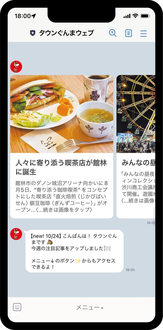 タウンぐんまウェブLINE公式アカウントでは、タウンぐんまウェブの最新情報を定期的に配信。群馬県の旬の話題を逃さずチェックすることができます。さらにメニュー画面には欲しい情報をまとめて見られる機能を設置。人気のイベント情報やおでかけ情報、ニューオープンの記事をまとめて見られます。また定期開催のプレゼント企画も配信するのでお見逃しなく!