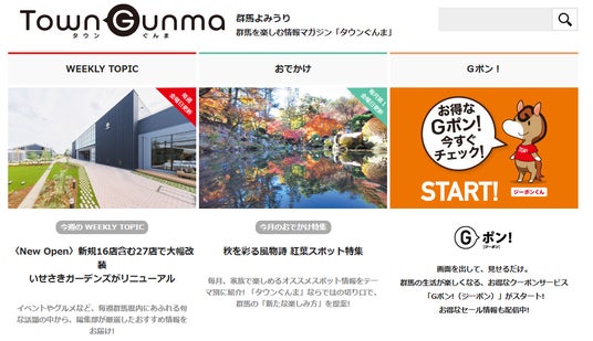 地域情報紙「タウンぐんま」のウェブ版で、「イベント情報」「お出かけスポット情報」「ニューオープン」の記事、そして「お得なクーポン情報」を紹介しているウェブサイト。ローカル紙の編集社ならではの、ニッチな記事や、斬新な切り口の記事を掲載しています。