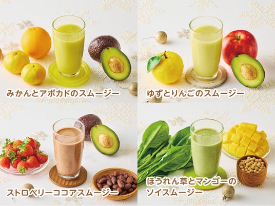 「みかん」「ゆず」「いちご」「ほうれん草」などをふんだんに使用した冬のスムージー全4種
