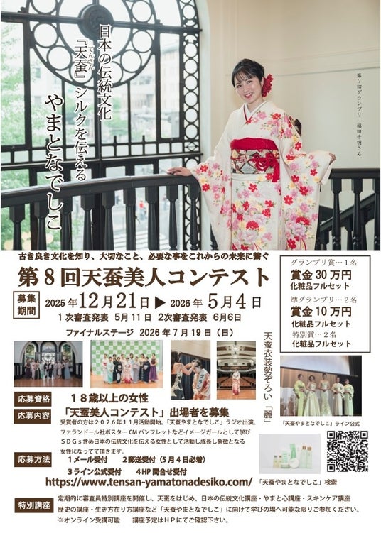 合同会社SHAFL(代表・福山百代 東京都世田谷区)は2025年12月21日(日)~2026年5月4日(月・祝)、令和元年よりスタートし、日本の伝統的なシルクで美を極めた「天蚕美人」ナンバーワンを決定する『第8回天蚕美人コンテスト』の同年7月開催にあたり、参加者のエントリー募集を開始いたします。