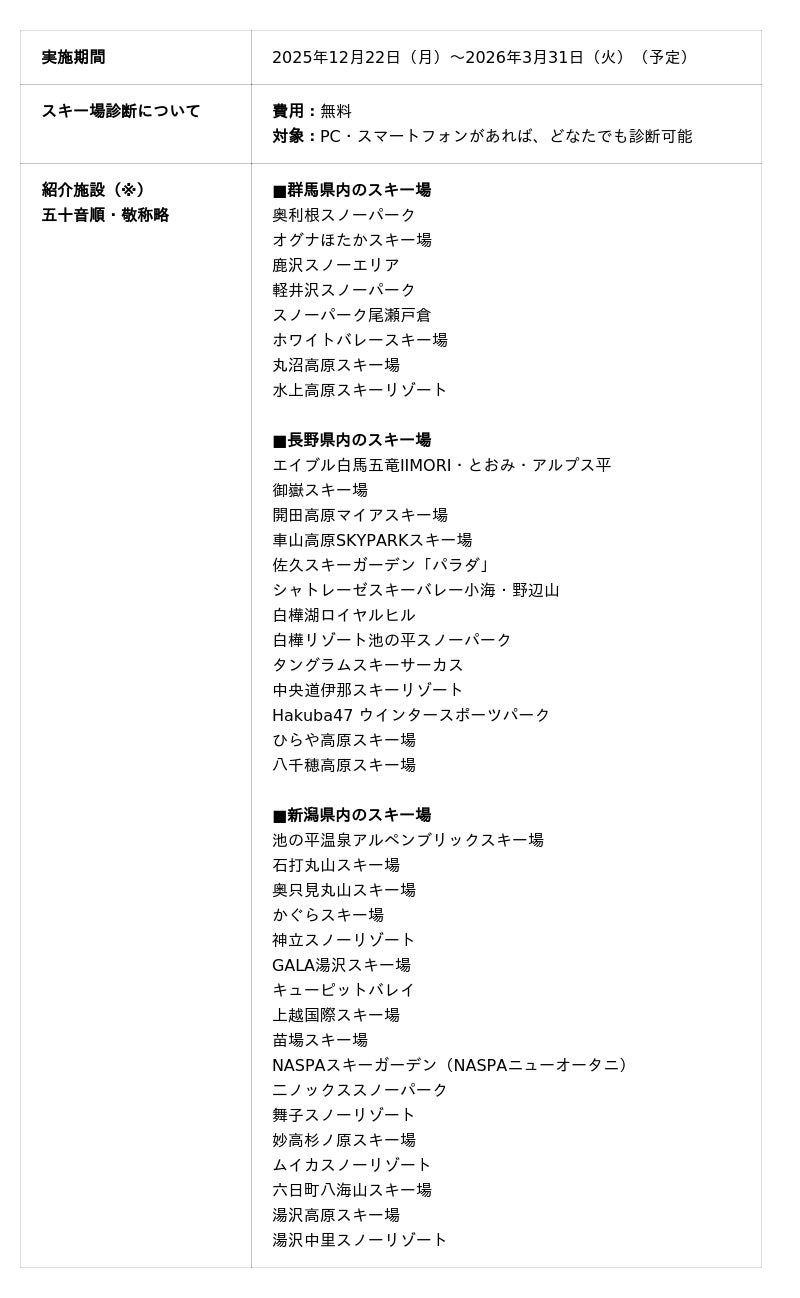 一般社団法人日本自動車連盟(JAF)群馬支部(支部長・星崎功明)、長野支部(支部長・宇都宮進一)、新潟支部(支部長・町田一越)は、3支部合同でスキー場を紹介するオンラインコンテンツ「【群馬・長野・新潟】あなたにぴったりのスキー場はどこ?」を2025年12月22日に公開しました。