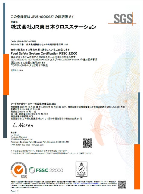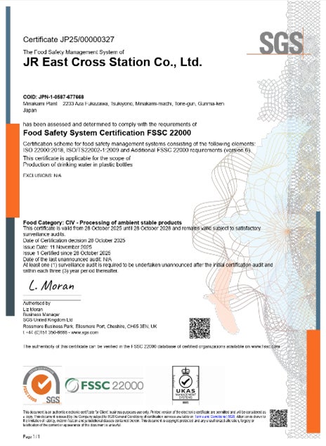 - 株式会社 JR 東日本クロスステーション ウォータービジネスカンパニー(所在地:東京都渋谷区、カンパニー長:竹内 健治)は、群馬県利根郡みなかみ町にある当社の飲料工場「JR東日本クロスステーション みなかみ工場」にて、食品安全マネジメントシステムに関する国際規格「FSSC22000」を取得しました。