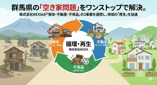 群馬県前橋市を拠点に、人・モノ・土地の「再生」をプロデュースする株式会社NEXIA(本社:群馬県前橋市、代表取締役:中沢 慎)は、深刻化する地域の空き家課題に対し、「解体工事(ラッキー解体)」「不動産買取(ラッキー不動産)」「不用品買取(おたからや)」の3つの事業ドメインを統合したワンストップ解決ソリューションを本格展開いたします。