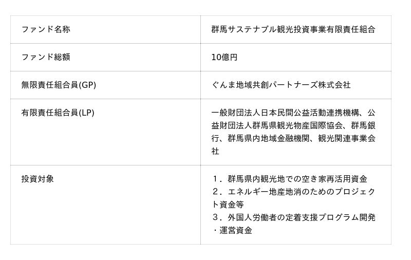 さらに、本協定の具体的な取り組みとして、群馬県内の金融機関や観光関連事業者と連携し「群馬サステナブル観光ファンド」の組成を進めております(2026年3月組成予定)。本ファンドは、群馬県内全域の観光地等を投資対象とし、1.空き家・空き店舗等の再活用、2.サステナブルツーリズムを意識した環境負荷低減、3.外国人労働者の雇用定着の3点を投資テーマとして、地域の課題解決に対して貢献することを目的としております。