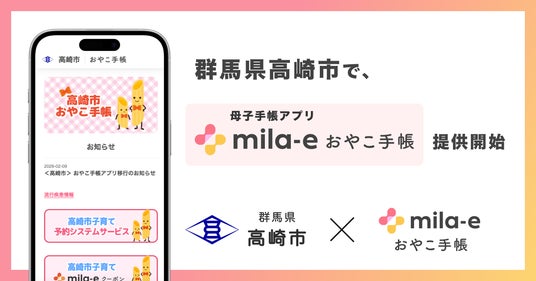 自治体向けサービスを開発する株式会社ミラボ(本社:東京都千代田区、代表取締役:谷川一也、以下「ミラボ」)の母子手帳アプリ「mila-e(ミライー) おやこ手帳」が、群馬県 高崎市に導入され、「高崎市おやこ手帳」として 提供を開始しました。