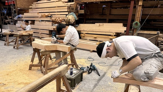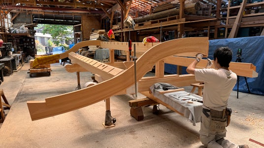 納材された吉野桧は、鋸(のこぎり)鑿(のみ)や鉋(かんな)を駆使し、四角い木材からなめらかな曲線を削り出して、各部材の大きさに成形されていきました。