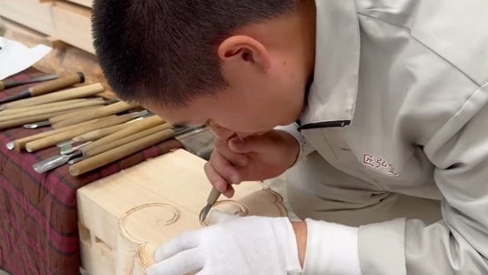 特に唐破風の場合は、通常なら真っ直ぐな垂木も「茨垂木(いばらたるき)」と言って、唐破風に添った曲がりくねった形になるので、幅広い材料が必要となります。彫刻で使われた唐草渦(からくさうず)など彫りの工程では、複数の宮大工と彫刻師がそれぞれの専門性を発揮しました。