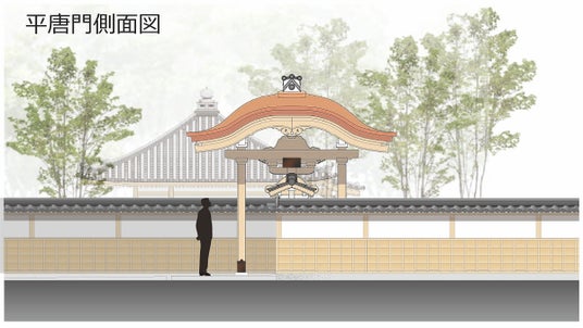 JR伊勢崎駅前の再開発に伴い、新しい道路に長く接道するという敷地条件から、唐破風を両側面に備える高貴な平唐門をご提案しました。設計は代表の横川が行い、彫刻から錺金物まですべてのデザインを手がけました。まずは手描きスケッチに始まり、最終の設計図では蟇股や木鼻などの彫刻に加え、御影石の四半敷き土間で、「力強さと優美さを兼ね備えた平唐門(ひらからもん)」をコンセプトに仕上げました。