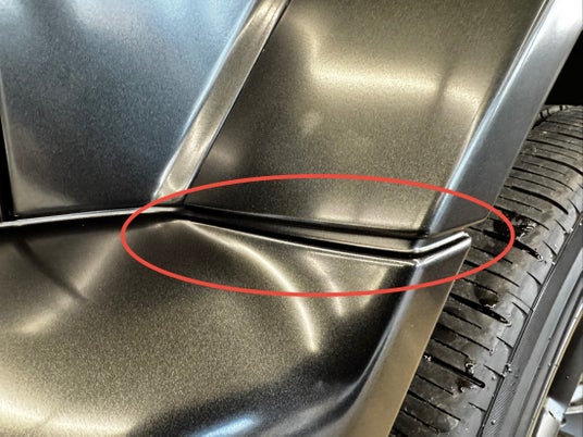 「データカット施工」は、作業が比較的容易でフィルムの無駄も少ないという利点がある一方で、ボディの複雑な曲面やエッジ部分を完全に覆いきれず、フィルムの切れ目や継ぎ目が目立ち、仕上がりが不自然に見えることがあります。特に、近年人気のマット系フィルムにおいては、この見た目の差が顕著に現れ、オーナー様の期待を裏切る結果となるケースも少なくありません。