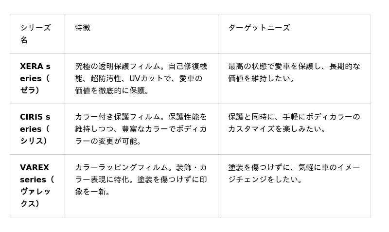 特に、透明保護フィルム「XERA series(ゼラ)」は、「貼っていることを忘れる」ほどの高い透明度と自己修復機能で、愛車を飛び石や傷から徹底的に守り、長期的な価値維持に貢献します。