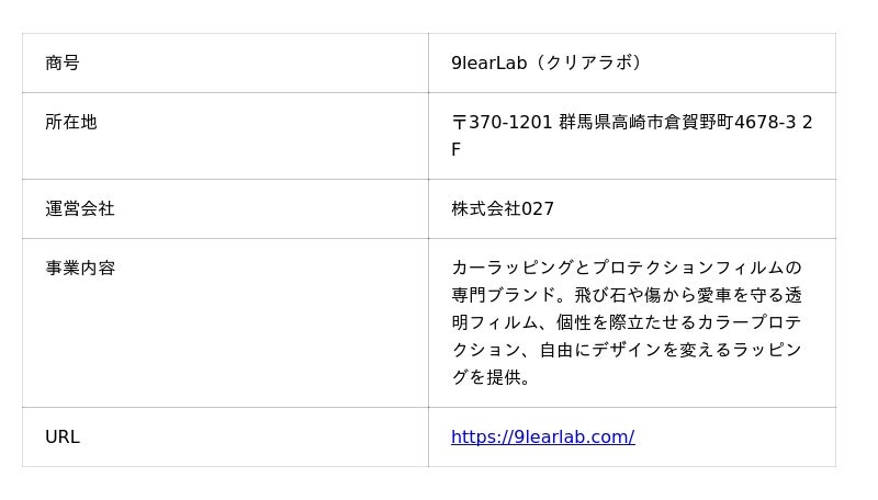 車の美しさと価値を追求する9learLab(運営会社:株式会社027、所在地:群馬県高崎市倉賀野町4678-3 2F)は、この度、最先端のプロテクションフィルム技術と、究極の精度を追求した熟練の職人技を融合させた新世代カープロテクションサービスを本格的に開始しました。