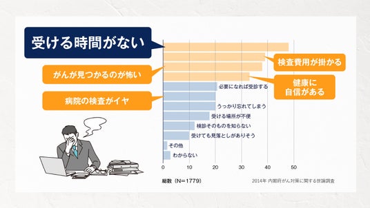 別の民間調査では、がん検診を受けない理由として「時間がない」が最大の理由であることが示唆される結果となりました。