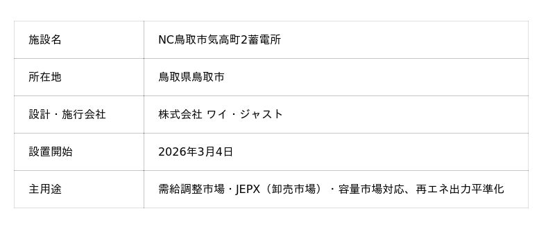 日本蓄電池株式会社(本社:東京都千代田区、代表取締役社長:漆原秀一)は、開発を進めているNC鳥取市気高町2蓄電所(所在地:鳥取県鳥取市)において系統用蓄電池を設置したことをお知らせいたします。