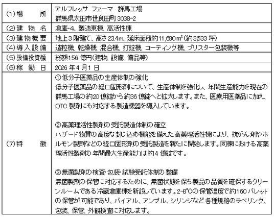 当社の子会社で医薬品等製造事業を行うアルフレッサ ファーマ株式会社(本社:大阪市、代表取締役社長執行役員:荒木勝利、以下「アルフレッサ ファーマ」)は、本日、群馬工場において新たな医薬品製造棟を稼働いたしましたので、下記のとおりお知らせいたします。